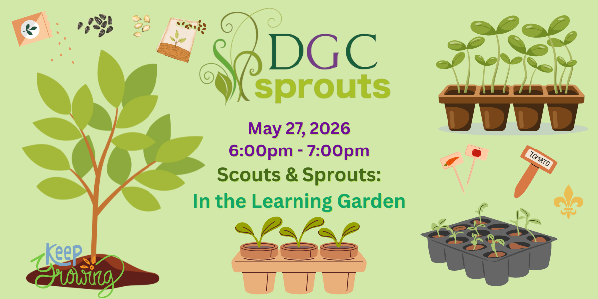 DGC Sprouts Meeting Wednesday, May 27, 2026 6:00 PM 7:00 PM St. John Lutheran Church - Darien, IL 7214 S Cass Ave Darien United States (map) Google Calendar ICS Sprouts & Scouts Garden PlantingSprouts families and local Scouts families are welcome to join us in the Learning Garden! We will be planting seeds and seedlings for our seasonal vegetable garden. Learn how to transplant seedlings and grow your own food! Please Register on Eventbrite LEARN MORE ABOUT SPROUTS More information on our Monthly Meeting and Registration HERE